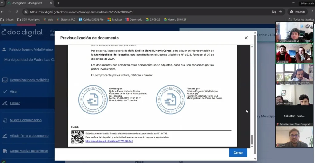La ceremonia de firma se realizó mediante una reunión online encabezada por la alcaldesa de Tocopilla, Ljubica Kurtovic Cortés, y el Administrador Municipal de Padre Las Casas, Patricio Vidal, quien participó en su calidad de alcalde subrogante. Ambos destacaron la importancia de este acuerdo para optimizar procesos administrativos, fortalecer la transparencia y mejorar la atención a la comunidad.